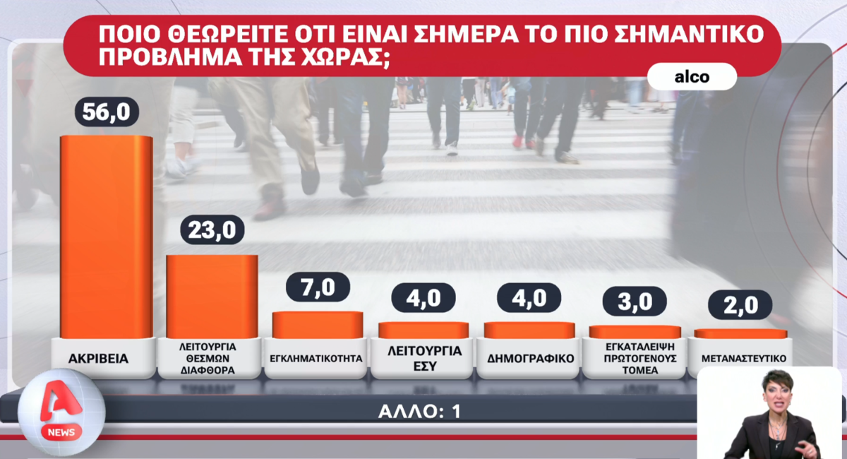Η ακρίβεια παραμένει το νούμερο ένα πρόβλημα για το 56% των πολιτών, ενώ η διαφθορά και η λειτουργία των θεσμών ανεβαίνουν δραματικά στις προτεραιότητες, συγκεντρώνοντας το 23% ως πρώτο και το 31% ως δεύτερο σημαντικότερο πρόβλημα της χώρας. Τα στοιχεία προκύπτουν από το δεύτερο μέρος της δημοσκόπησης της Alco για τον Alpha.